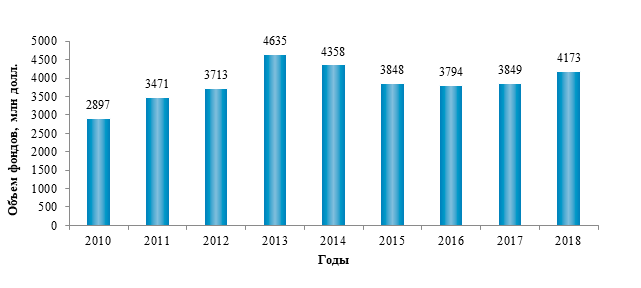 Рисунок 7 – Объем венчурных фондов в России в 2010-2018 гг., млн. долларов США [6]
