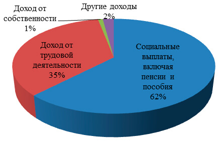 Важным условием достижения, сохранения и повышения независимости, самостоятельности и социальной активности пожилых людей является наличие у них доходов, обеспечивающих возможность удовлетворения жизненных потребностей и развития. В настоящее время доходы пожилого населения в России формируются за счет различных источников, главным из которых являются пенсии. Доля пенсий в денежных доходах домохозяйств, состоящих из пенсионеров, превышает 60% (рис. 1).